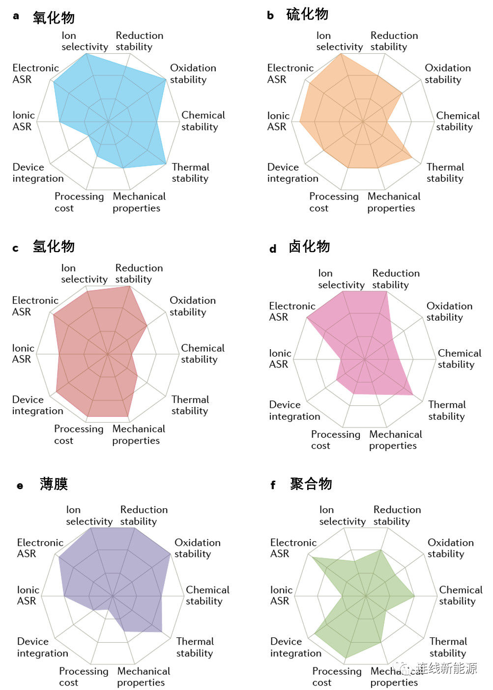 為了滿足實(shí)際應(yīng)用,固態(tài)電解液應(yīng)具有以下性質(zhì):離子電導(dǎo)率高,在特定區(qū)域的離子電阻低,在特定區(qū)域的電子電阻高,離子選擇性高,電化學(xué)窗口寬,與其他部件的化學(xué)兼容性好,熱穩(wěn)定性好,機(jī)械性能優(yōu)異,制備過程容易,成本低,設(shè)備集成容易,低毒。表1總結(jié)了現(xiàn)有的固態(tài)電解液材料。圖1的雷達(dá)示意圖展示了這些固態(tài)電解液材料的性質(zhì)。