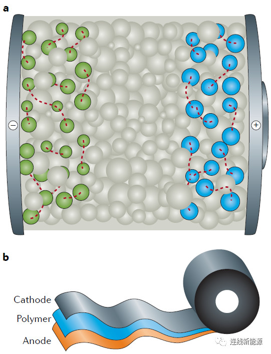 圖2?全固態(tài)電池:a.?無機(jī)固態(tài)電解液示意圖(綠色、藍(lán)色和灰色小球分別代表陽極、陰極和固態(tài)電解液材料);b.聚合物固態(tài)電解液的示意圖