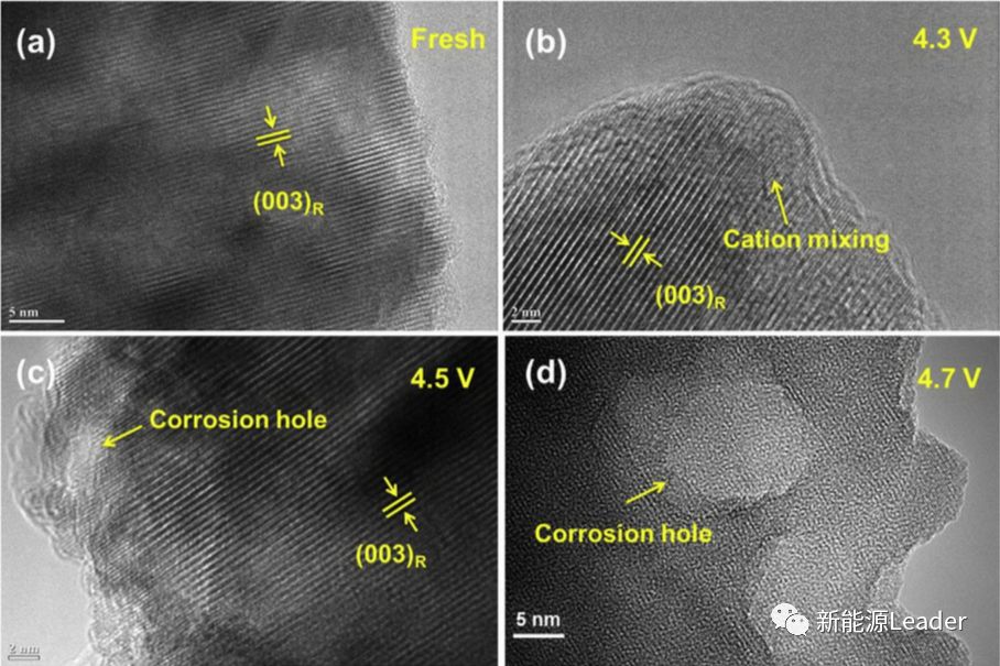 常見的三元材料NCM主要包含Ni、Co和Mn三種過渡金屬元素,其中Ni貢獻了主要的容量,隨著Ni含量的提高材料的容量也會相應(yīng)地提高,例如目前的NCM811材料克容量普遍達(dá)到190-200mAh/g,但是Ni含量的增加也會導(dǎo)致三元材料結(jié)構(gòu)穩(wěn)定性變差,容易發(fā)生過渡金屬元素的混排現(xiàn)象,例如復(fù)旦大學(xué)的Siyang Liu等人【1】通過HRTEM對不同電壓下循環(huán)后的NCM622材料表層進行了檢測,發(fā)現(xiàn)在4.3V截止電壓下循環(huán)50次后,雖然NCM622材料的主體結(jié)構(gòu)仍然保持了良好的層狀結(jié)構(gòu),但是在材料的表面能觀察到部分區(qū)域出現(xiàn)了過渡金屬離子混排的現(xiàn)象。當(dāng)截止電壓提高到4.5V、4.7V后材料的晶體結(jié)構(gòu)衰降變的更加嚴(yán)重,從圖中能夠看到在高的截止電壓下過多的Li脫出導(dǎo)致金屬陽離子進入到Li層,這會阻擋Li的擴散通道,減少Li的活性點位,導(dǎo)致界面電荷交換阻抗的增加和可逆容量的衰降。