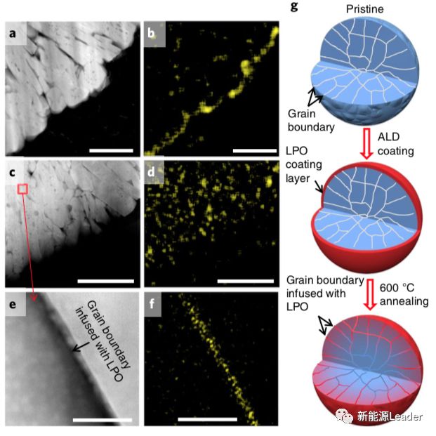 為解決NCM材料循環(huán)過程中應(yīng)力積累導(dǎo)致的二次顆粒內(nèi)部產(chǎn)生的裂紋問題,美國西北太平洋國家試驗室的Pengfei Yan等人【5】也給出了自己的答案,Pengfei Yan通過原子層沉積的方式在高鎳NCM(LiNi0.76Mn0.14Co0.10O2)顆粒表面沉積了一層Li3PO4,并通過600℃下高溫處理,讓Li3PO4與NCM顆粒之間形成了一層擴散層。分析表明經(jīng)過熱處理后Li3PO4不僅僅聚集在顆粒的表面,還沿著NCM一次顆粒之間的縫隙浸入到顆粒內(nèi)部,填補了這些裂紋,避免了循環(huán)過程中電解液對NCM顆粒內(nèi)部的侵蝕,有效的提高了結(jié)構(gòu)穩(wěn)定性,200次循環(huán)(2.7-4.5V,C/3)后,經(jīng)過包覆處理的NCM材料容量保持率達(dá)到91.6%,而沒有包覆的NCM材料容量保持率僅為79%,在60℃高溫下LPO包覆同樣表現(xiàn)出色,容量保持率達(dá)到79%,遠(yuǎn)高于沒有包覆處理NCM的58.3%。