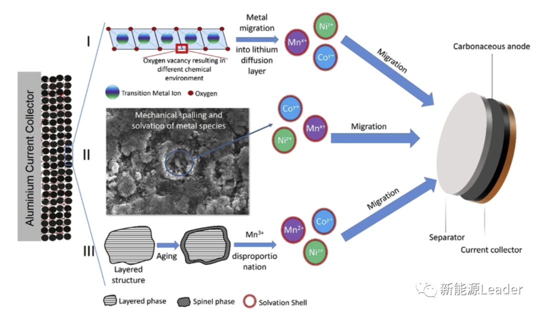 解決過渡金屬元素的溶解問題,上面提到的元素?fù)诫s和表面包覆都是非常有效的方法,通過提升NCM/電解液界面的穩(wěn)定性,能夠有效的減少過渡金屬元素的溶出,例如豐田公司的研究人員【7】就通過在NCM材料表面包覆一層ZrO2層,顯著改善了界面穩(wěn)定性,提升了NCM材料的循環(huán)穩(wěn)定性。針對那些溶解到電解液中的過渡金屬元素,人們開發(fā)了具有捕捉Mn元素功能的隔膜【8】,該隔膜表面含有氮化物,能夠與電解液中的Mn3+發(fā)生絡(luò)合反應(yīng),從而實現(xiàn)對電解液中的Mn3+的捕捉,極大的降低了電解液中Mn元素的濃度,減少了Mn元素在負(fù)極表面的沉積,有效提升了電池的循環(huán)性能。