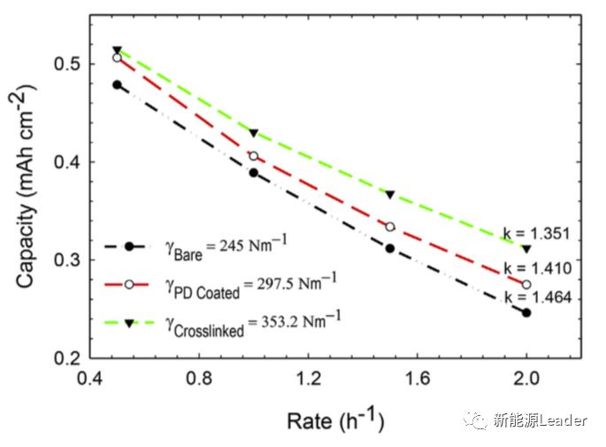 下圖展示了試驗得到的具有不同粘接強度的硅負(fù)極的倍率性能(普通Cu箔、多巴胺涂層處理Cu箔和交聯(lián)多巴胺涂層處理Cu箔),從圖中我們能夠看到三種電極的粘接強度分別為245、297.5和352.5N/m,從三條倍率性能曲線上能夠看到粘接強度最大的交聯(lián)多巴胺涂層處理Cu箔初始容量最高,倍率性能最好,這主要是因為更大的粘接強度能夠保證活性物質(zhì)與集流體之間更好的接觸,避免高倍率下因為顆粒應(yīng)力增大導(dǎo)致的接觸不良。