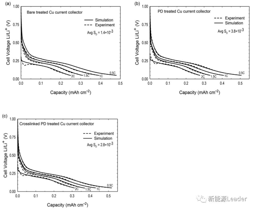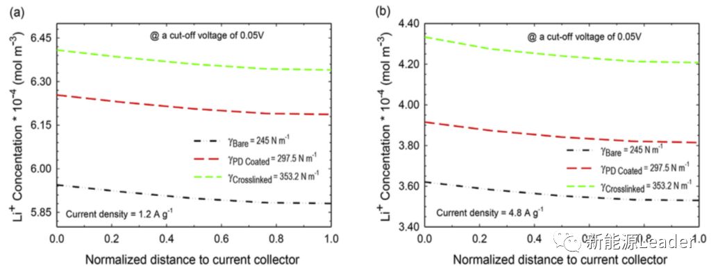 下圖為在0.5C(下圖a)和2C(下圖b)倍率下嵌鋰結(jié)束后,電極內(nèi)部不同位置的Li濃度的變化(0代表為電極/電解液界面,1代表電極/集流體界面),從圖中可以看到三種粘接強度不同的電極在最終嵌鋰結(jié)束后電極內(nèi)部Li濃度也有很大的不同,其中粘接性最好的交聯(lián)多巴胺涂層處理Cu箔電極的Li濃度最高,這再次表明電極與集流體之間的粘接性強弱會對電極的容量產(chǎn)生顯著的影響。