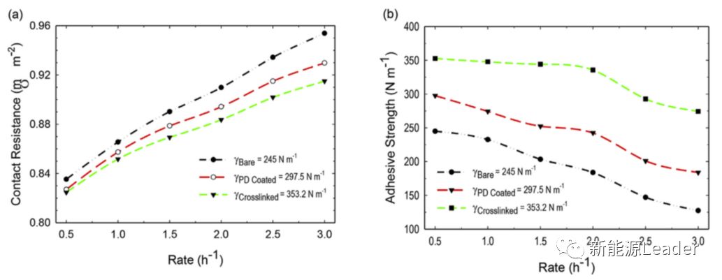 為了解決硅負(fù)極體積膨脹對負(fù)極結(jié)構(gòu)的破壞,粘結(jié)劑的選擇就變的尤為重要,通常而言我們認(rèn)為含有較多羧基的粘結(jié)劑,例如PAA、CMC粘結(jié)劑能夠與硅負(fù)極表面的一些含氧官能團相互作用,從而增強負(fù)極結(jié)構(gòu)的穩(wěn)定性【1】。那么問題來了是否活性物質(zhì)與集流體之間的粘接性越強電化學(xué)性能越好呢?近日韓國DGIST技術(shù)研究院與澳大利亞的臥龍崗大學(xué)的技術(shù)人員開發(fā)了化學(xué)-機械耦合模型,研究了活性物質(zhì)與集流體之間的粘接性與電性能之間的關(guān)系,研究表明更高的粘接性有利于降低接觸電阻,提高電極的容量發(fā)揮和倍率性能。