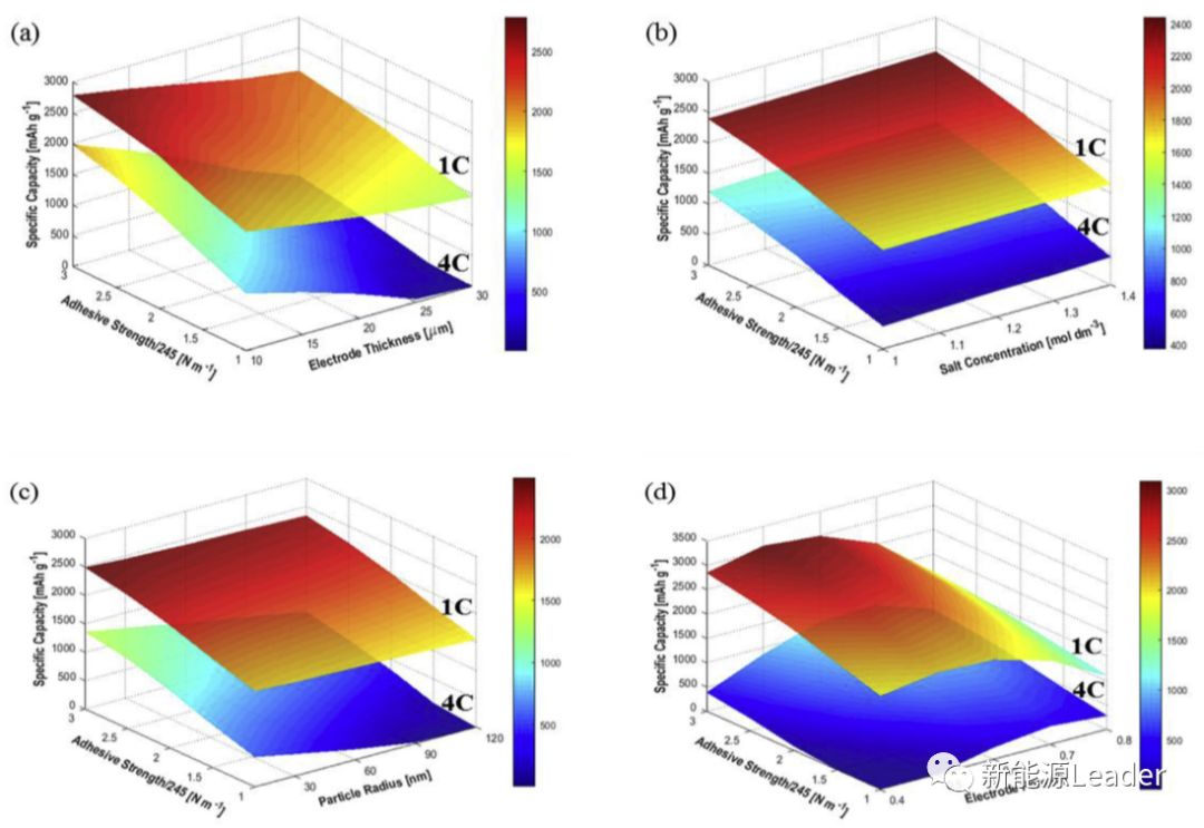 下圖為模型獲得的Si電極在1C和4C倍率下的比容量與電極厚度、Li鹽濃度、Si顆粒直徑和電極孔隙率之間的關(guān)系,從圖中能夠看到電極厚度的增加會導(dǎo)致電極比容量的下降和倍率性能的下降,提高Li鹽的濃度并不會對電極的比容量產(chǎn)生顯著的影響,增大Si顆粒的直徑會導(dǎo)致電極的比容量和倍率性能的顯著降低,電極孔隙率的下降會使得電極的比容量提高,但是孔隙率下降到0.5-0.6以下后反而會導(dǎo)致電極比容量和倍率性能的降低。
